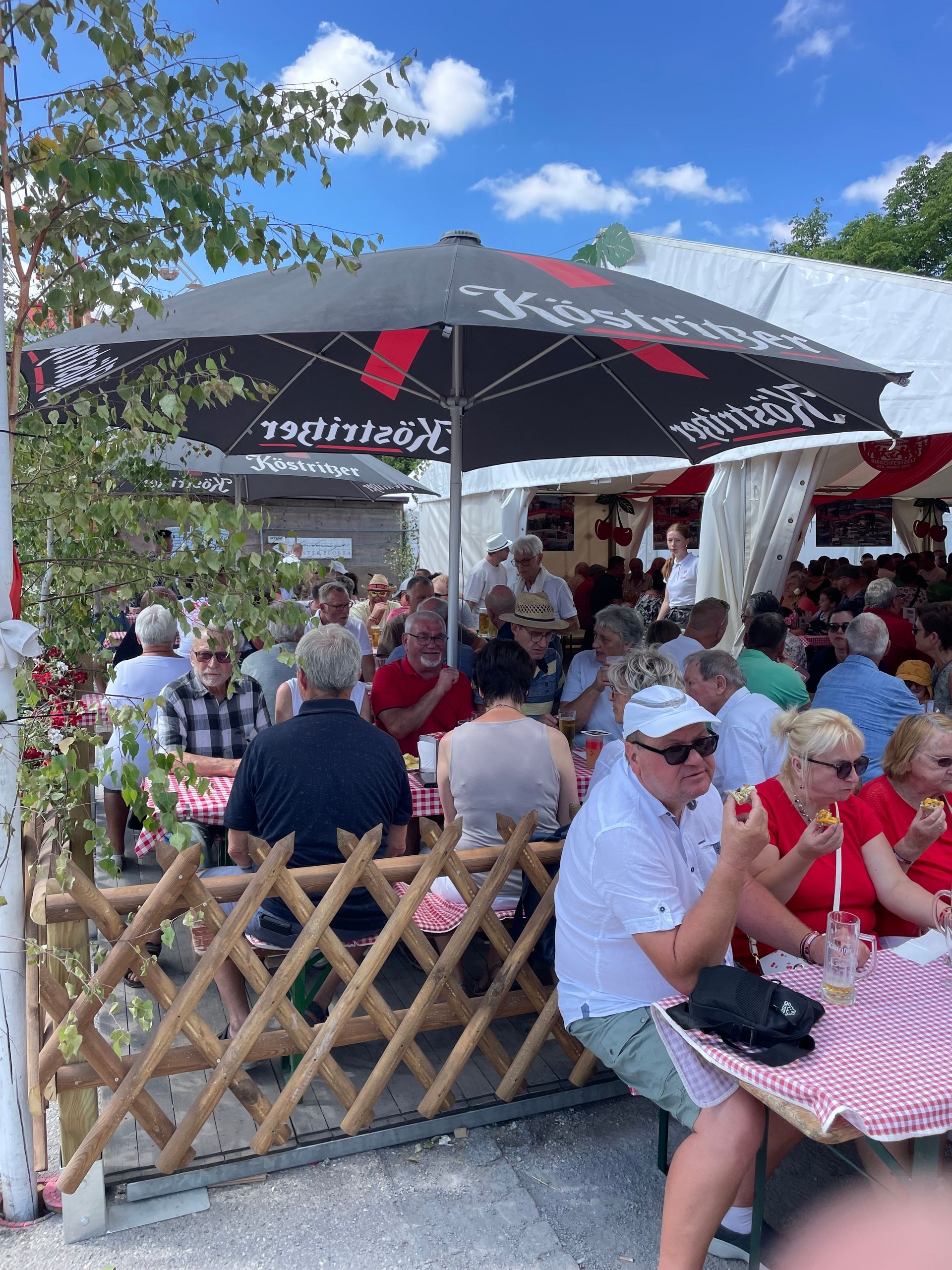 Der letzte Tag des Kirschfestes hat begonnen. Punkt 18 Uhr strömten die Gäste zu ihren, im Vorfeld reservierten Tischen. Einige wurden noch verteilt und andere bekamen durch zusätzliche Bänke eine Chance, in unserem Zelt den Abschluss gebührend zu feiern. Andreas Kühn und Band sorgten für beste Stimmung. Die kaputten Gliedmaßen der Belegschaft wurden noch einmal in Gang gebracht und so konnten wir 24 Uhr mit dem Singen des Kirschfestliedes (ohne instrumentale Begleitung) das Fest emotional zu Ende bringen.