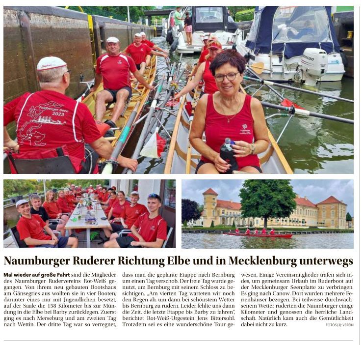 Mit drei Doppelvierern brach der Naumburger Ruderverein Rot-Weiß kürzlich zu seiner JahresRudertour auf. Nach einer Begrüßung und Einweisung am Bootshaus am Klingenberg nahm man die viertägige Fahrt zur Saalemündung nach Barby in Angriff, inklusive 160 Kilometern, 17 Schleusen und 56 Brücken...